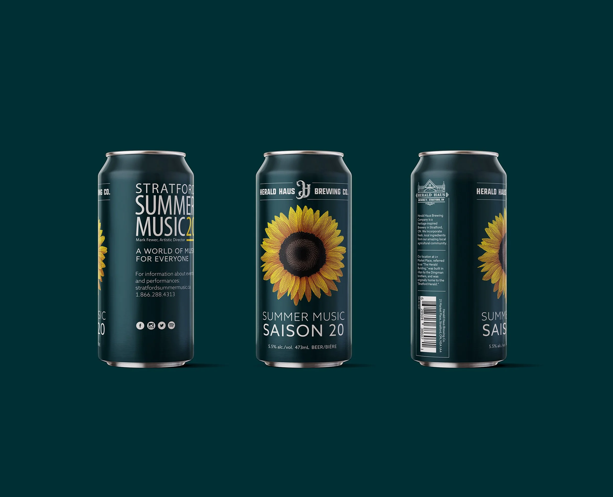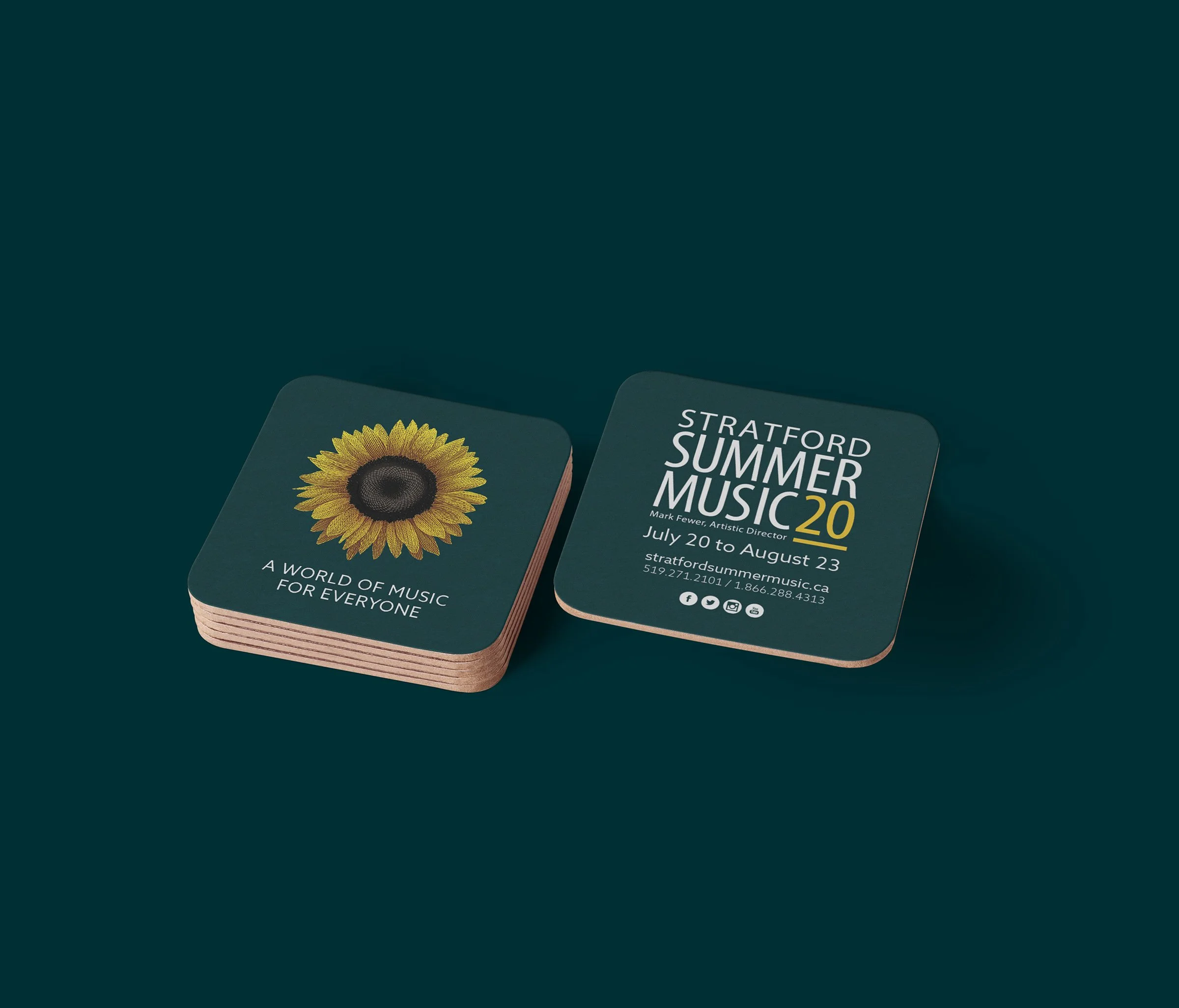 Stratford Summer Music is an annual multi-week music festival featuring 100+ artists throughout downtown Stratford, Ontario. Their performances span a variety of genres with the goal of bringing musical excellence to a wide audience including families and youth. The season illustration by Art Director Scott McKowen conveys a moment of wonder inspired by music and is the centrepiece of the 2020 season brand. I developed a new colour palette for the season based on the illustration as well as a new typography system prioritizing accessibility and consistency. I designed print and digital marketing materials for the festival including posters, flyers, programmes, and a 64-page magazine-style brochure featuring the festival’s complete offerings. The festival partnered with local breweries and restaurants to produce coasters and beer cans to capture the vibrant tourism and hospitality scene in Stratford.